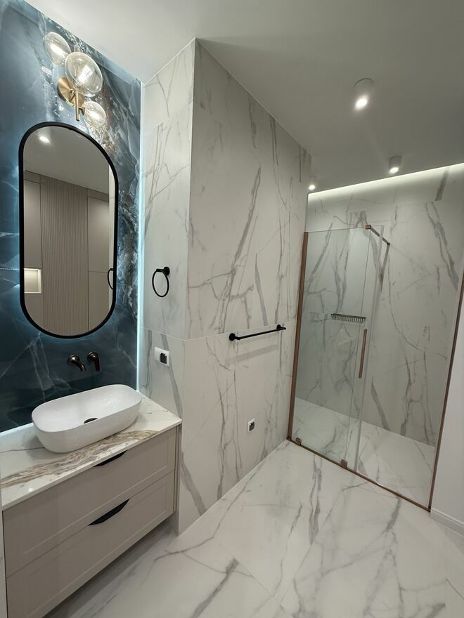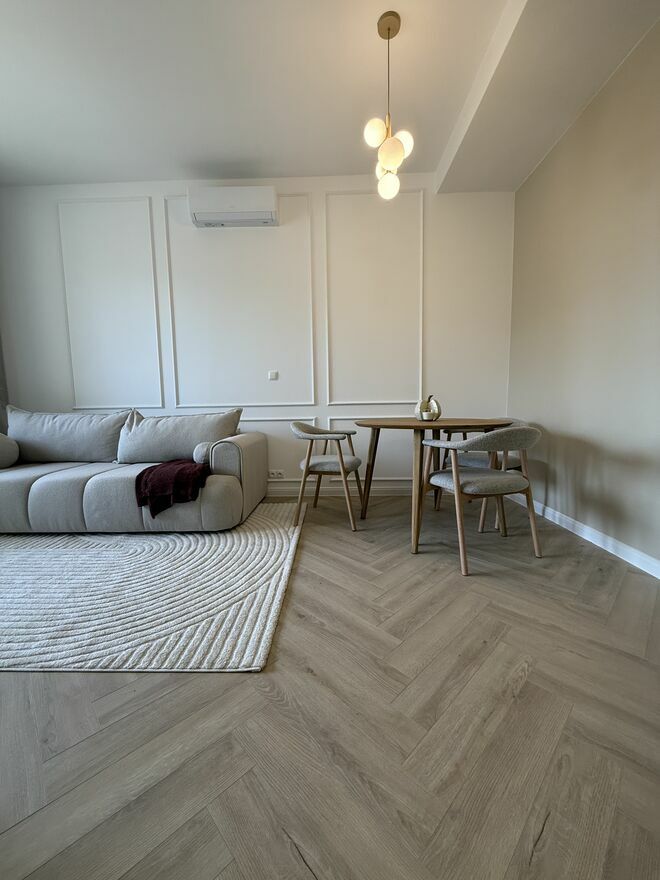 The apartment is fully furnished and equipped with essential household appliances (washing machine, oven, dishwasher, microwave, coffee machine, TV - will be installed soon). It has been finished to the highest standard, with interiors designed by interior architects and finished using high-quality materials such as granite and Italian tiles. Additional advantages include high ceilings (2.9m) and large windows, making the apartment bright and spacious. All built-in furniture was custom-made by a carpenter. The apartment is equipped with air conditioning.