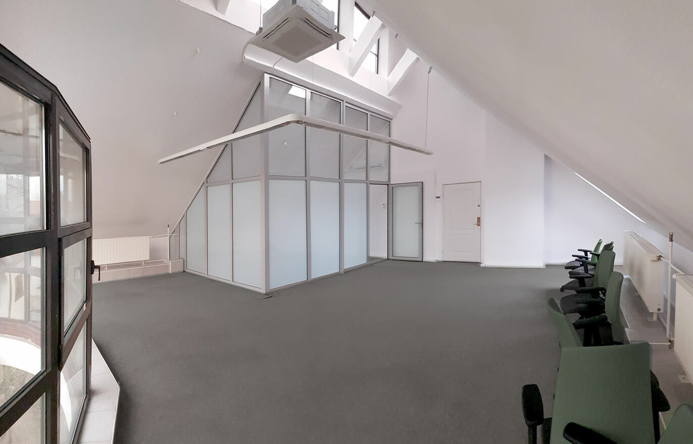 W pomieszczeniu wydzielone jest pomieszczenie konferencyjne.