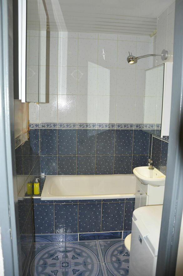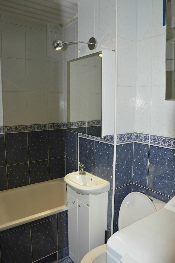 • W łazience wanna, umywalka, WC, pralka , 3 duże lustrzane szafki.