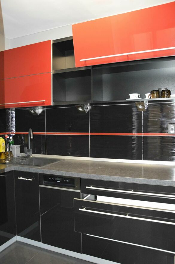 • Kuchnia wyposażona w zmywarkę, lodówkę, piekarnik i wiele pojemnych szafek, półek i schowków.