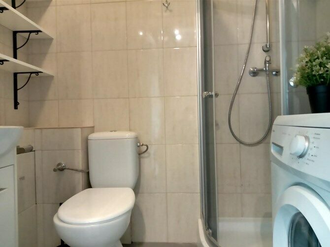 Łazienka z WC: umywalka, pralka, prysznic, półki, szafki.