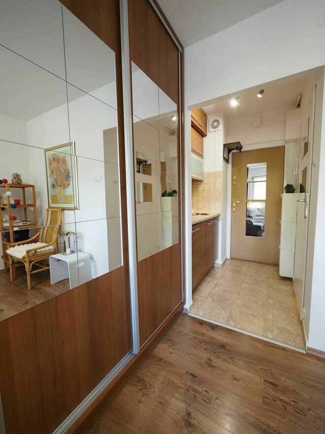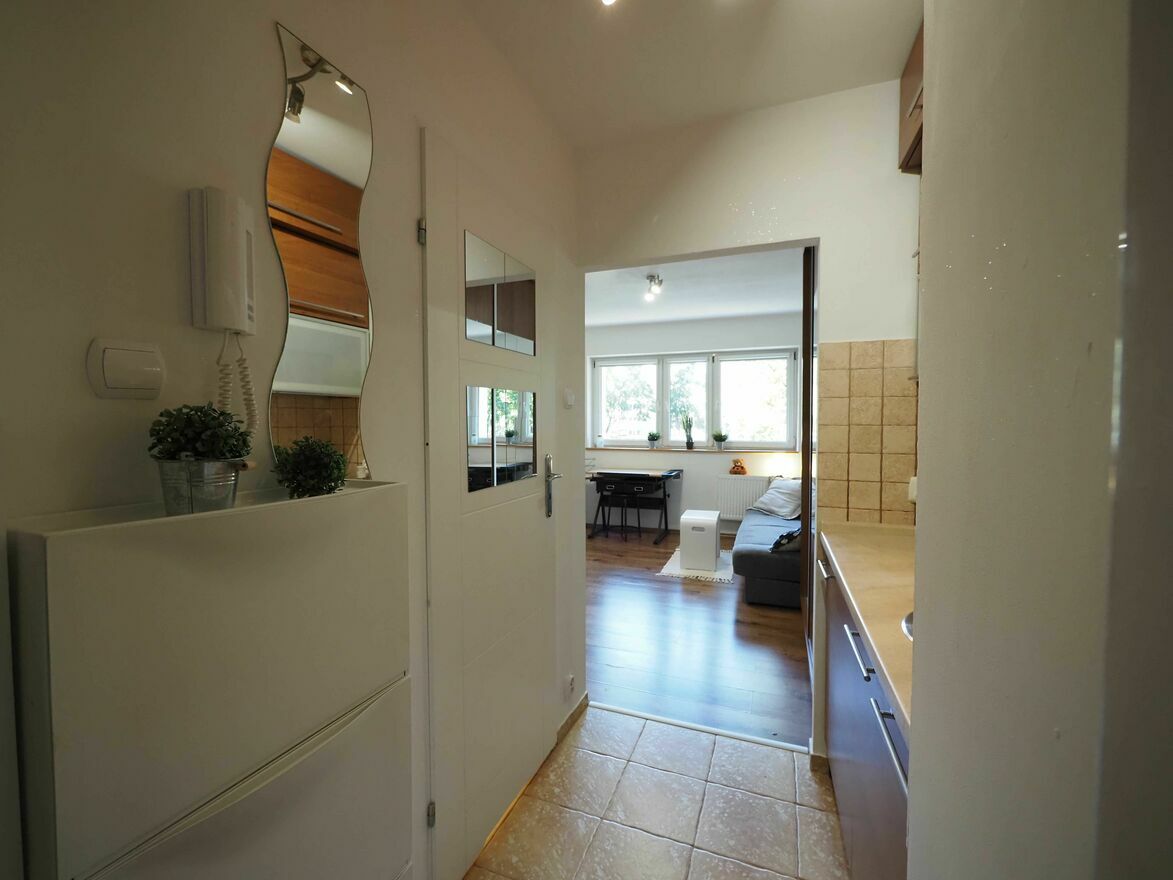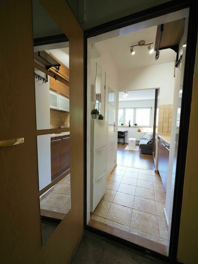 Przy wejściu znajdują się wygodne szafki na buty, wieszak na ubrania, domofon, lustra.