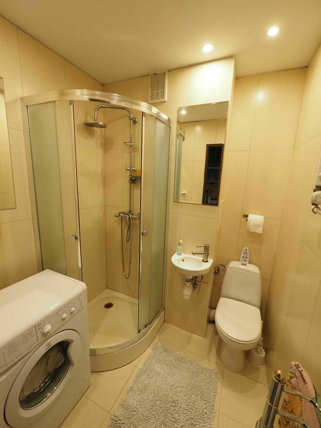 Duża łazienka z prysznicem, pralką, umywalką i wc.