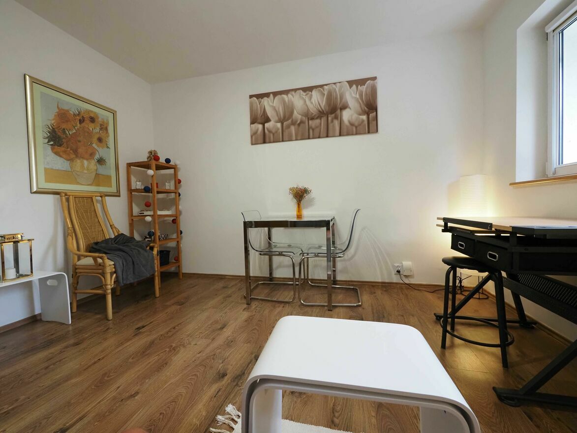 Salonik umeblowany z bardzo dużą szafą z lustrami, wygodnym rozkładanym tapczanem z wysuwanymi 3 stolikami, rozsuwanym szklanym stołem i komfortowymi krzesłami, fotel oraz duże biurko z regulowaną wysokością i kątem nachylenia.