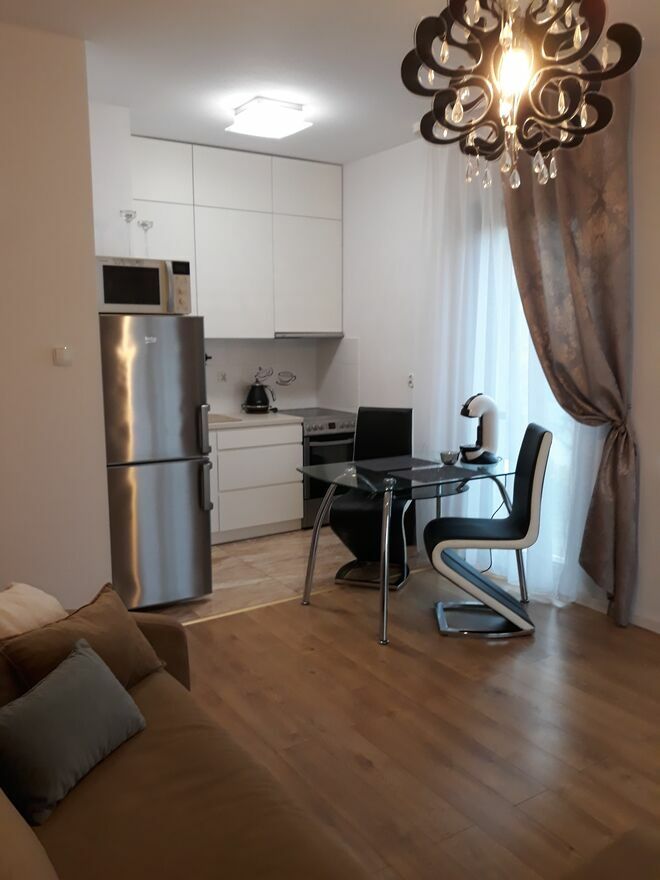 W mniejszym pokoju znajduje się pojemna szafa. W pokoju dziennym znajduje się duża, wygodna, rozkładana kanapa (230x170) z dwoma pojemnikami na pościel. Duże okna.