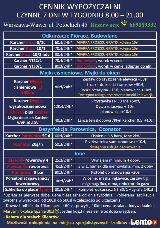 Dzień dobry,Jesteśmy Wypożyczalnią Urządzeń zlokalizowaną w Warszawie przy ul. Potockich 45.