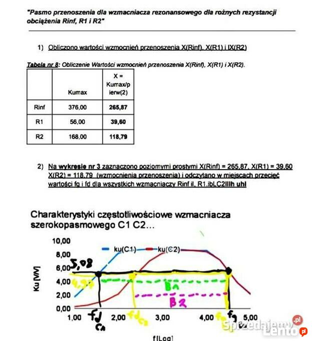 Pasmo przenoszenia wzmacniacza szerokopasmowego dla dwóch rożnych pojemności sprzęgających C1 i C2.
