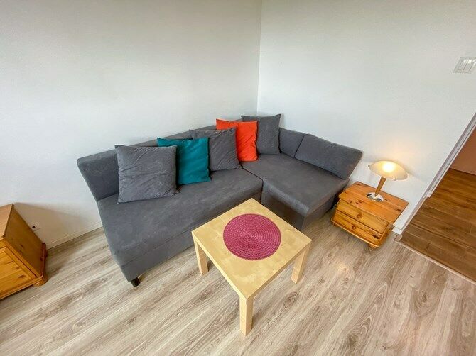 Pokój: rozkładana sofa, szafka z lampką nocną, 2 komody, stół +