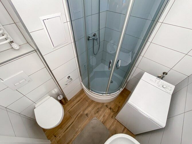 Łazienka: prysznic, pralka, umywalka z szafką.
