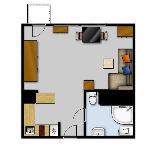 Składa się z pokoju z wyjściem na niewielki balkon, aneksu