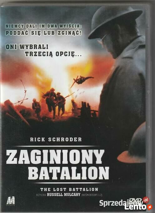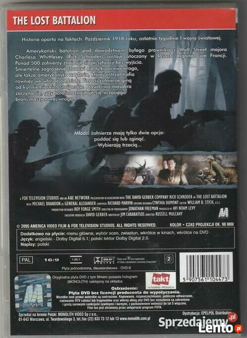 THE LOST BATTALION Historia oparta na faktach. Październik 1918 roku, ostatnie tygodnie I wojny światowej. Amerykański batalion pod dowództwem byłego prawnika z Wall Street majora Charlesa Whittlesey (Rick Schroder) zostaje otoczony w lasach Argonne we Francji. Ponad 500 żołnierzy znajduje się w sytuacji bez wyjścia. Śmiertelne zagrożenie stanowi nie tylko armia wroga, ale także amerykańska artyleria, której ostrzał trafia również we własne oddziały. Pierwsi żołnierze giną od kul niemieckich snajperów. Prawdziwa masakra zaczyna się, gdy batalion znajduje się w zasięgu broni maszynowej wroga. Młodzi żołnierze mają tylko dwie opcje: poddać się lub zginąć. Wybierają trzecią. A FOX TELEVISION STUDIOS AND AN A&E NETWORK PRESENTATION IN ASSOCIATION WITH THE DAVID GERBER COMPANY RICK SCHRODER IN THE LOST BATTALION WITH MICHAEL BRANDON AS GENERAL ALEXANDER COMPOSER RICHARD MARVIN COSTUME DESIGNER CYNTHIA DUMONT EDITOR WILLIAM B. STICH, A.C.E. PRODUCTION DESIGNER ROY FORGE SMITH DIRECTOR OF PHOTOGRAPHY JONATHAN FREEMAN PRODUCED BY AVI NOAM LEVY EXECUTIVE PRODUCER DAVID GERBER WRITTEN BY JIM CARABATSOS DIRECTOR RUSSELL MULCAHY KOLOR CZAS PROJEKCJI OK. 90 MIN Dodatkowo na płycie: menu główne, wybór scen, zwiastun, wkrótce w kinach, wkrótce na DVD Język: angielski - Dolby Digital 5.1; polski lektor Dolby Digital 2.0. Napisy: polski KArton 95 Ogłoszenie jest aktualne dopóki znajduje się na stronie . Odbiór osobisty lub wysyłkaSprawdź zainteresowanie tym ogłoszeniem