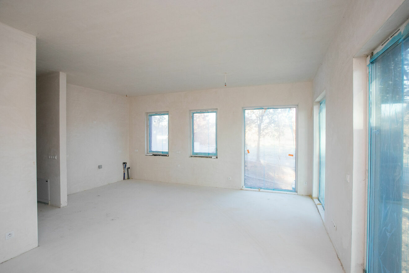 Na wysokim parterze znajduje się przestronny salon z aneksem kuchennym około 30m /niezwykle widny z kilkoma oknami panoramicznymi/ oraz wyjściem na taras i zejściem do planowanego ogrodu, dodatkowy pokój, łazienka.