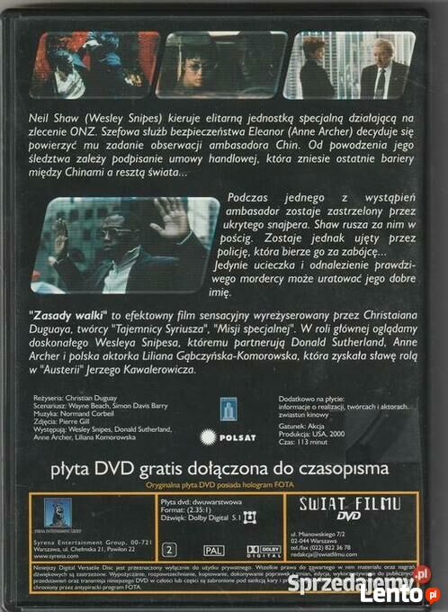 Rosyjska mafia zamierza wprowadzić na światowy czarny rynek marzenie terrorystów: mikro bombę. Międzynarodowe służby wywiadowcze robią wszystko, by do tego nie dopuścić. Bez rezultatów. Gdy świat stoi w obliczu wybuchu nowej fali terroryzmu, na scenie pojawia się Marcus Ray - człowiek, który nie boi się walki. Porzuca swoje beztroskie życie biznesmena i playboya, by wkroczyć w sam środek konfliktu międzynarodowych tajnych służb z handlarzami bronią i terrorystami. To tylko kwestia czasu, żeby mikro bomby trafiły w ręce szaleńca, który nie zawaha się ich użyć. Chyba, że Marcus Ray będzie szybszy. Scenariusz: Wayne Beach, Simon Davis Barry Muzyka: Normand Corbeil Występują: Wesley Snipes, Donald Sutherland, Anne Archer, Liliana Komorowska PICTURES Zdjęcia: Pierre Gill Dodatkowo na płycie: informacje o realizacji, twórcach i aktorach. zwiastun kinowy Gatunek: Akcja Produkcja: USA, 2000 Czas: 113 minut Dźwięk;polski lektor Karton 88 Ogłoszenie jest aktualne dopóki znajduje się na stronie . Odbiór osobisty lub wysyłkaSprawdź zainteresowanie tym ogłoszeniem