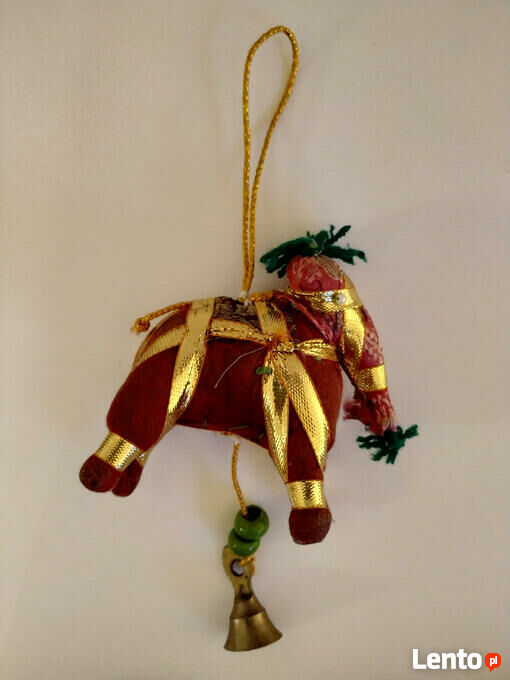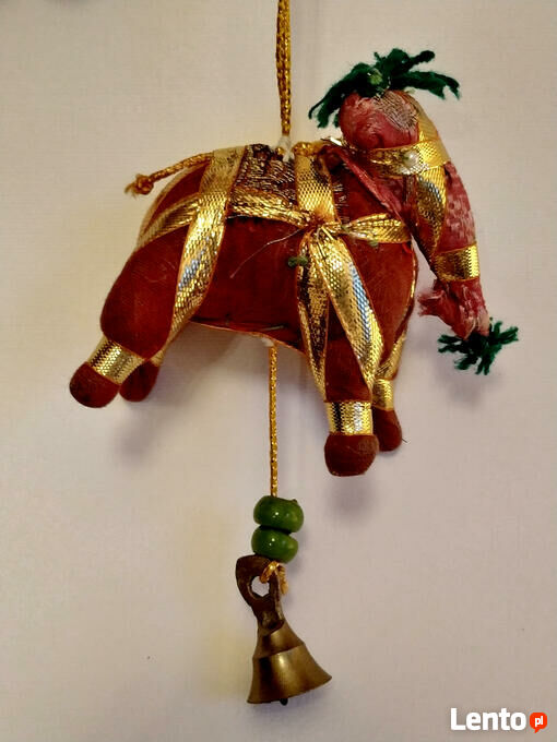 Zawieszka słonik z materiału, złotej wstążki i włóczki wraz z mosiężnym dzwoneczkiem. Rękodzieło. Kraj pochodzenia: Indie.Długość całkowita: 20 cm