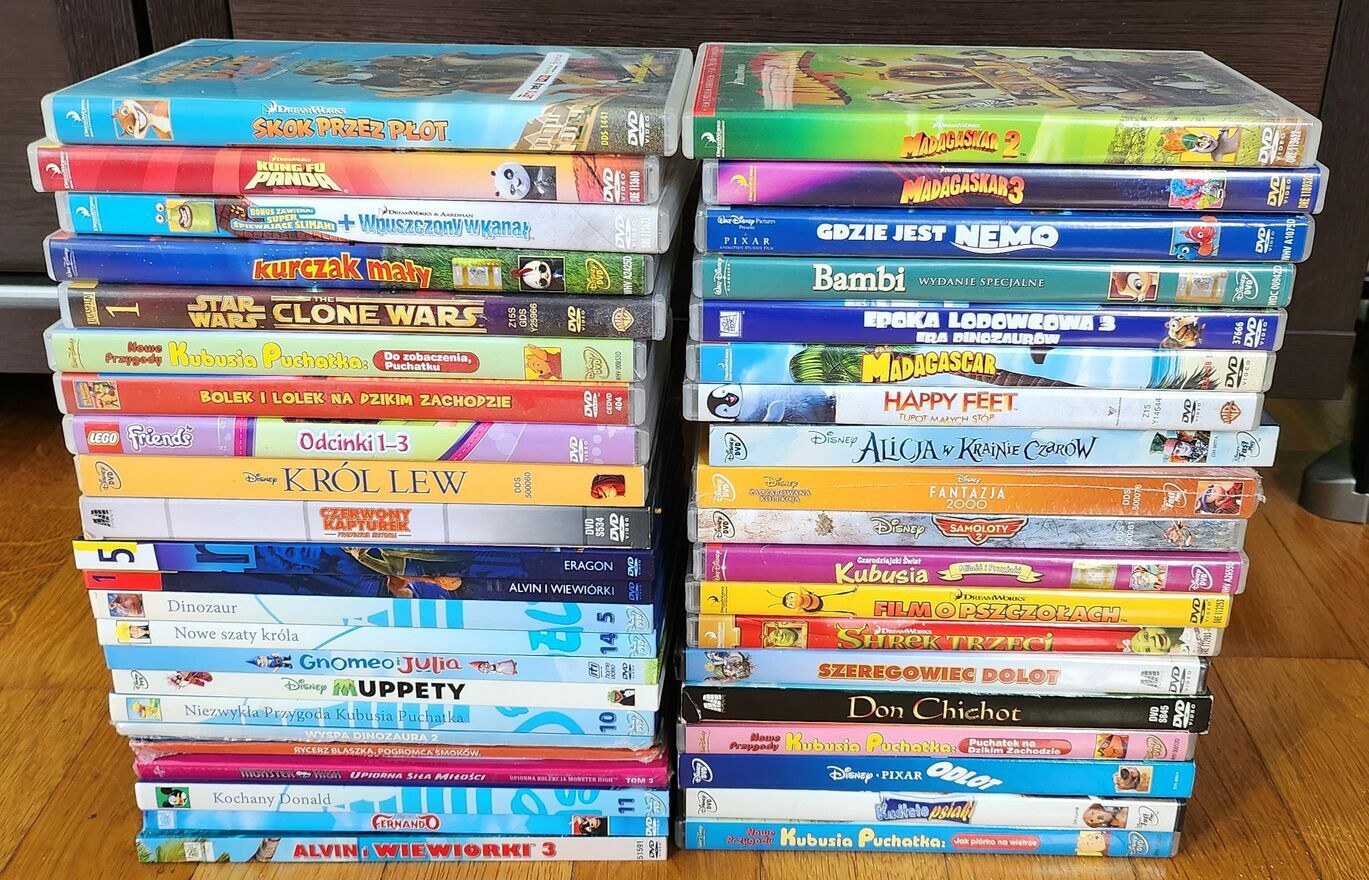 "ogłoszenie widoczne = AKTUALNE"Zestaw 44 filmów dla dzieci na płytach DVD. Płyty bez uszkodzeń, można zweryfikować przy odbiorze. Zestaw do sprzedania w całości.