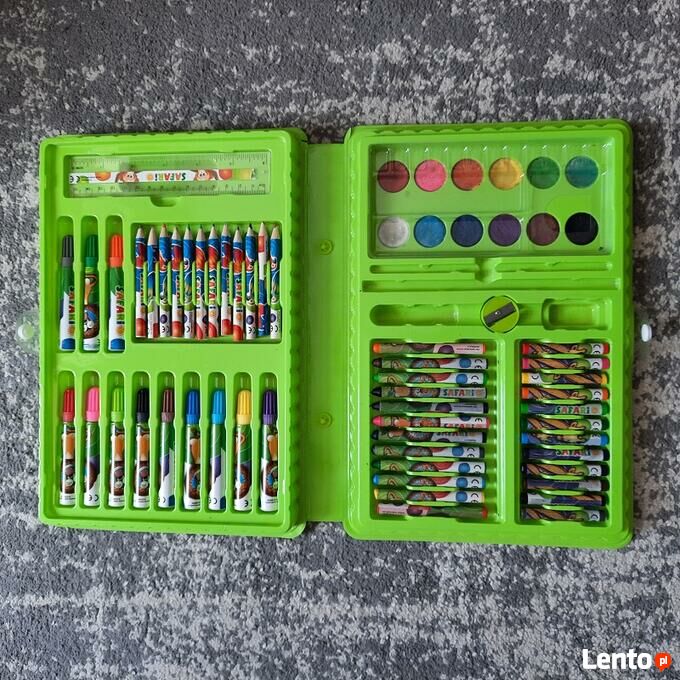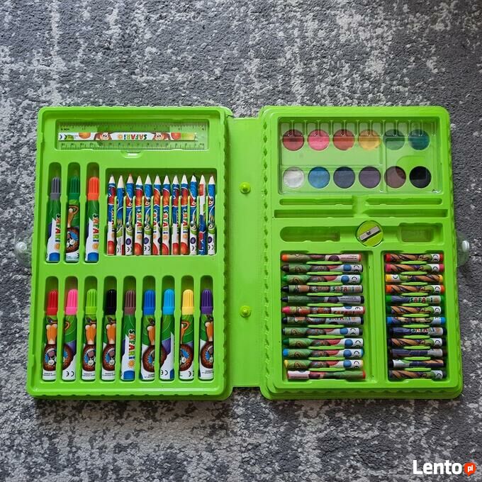 Wspaniały zestaw od firmy Starpak dla małych artystów pomaga rozwijać im kreatywność, poczcie smaku oraz uczy różnych technik malarskich. Składa się z 68 elementów: farb akwarelowych, kredek, pisaków, gumki, temperówki, ołówka, kleju i linijki. Wszystkie elementy zestawu są wykonane z wysokiej jakości materiałów, co zapewni długie użytkowanie.* Brakuje w zestawie ołówka, pędzla, gumki