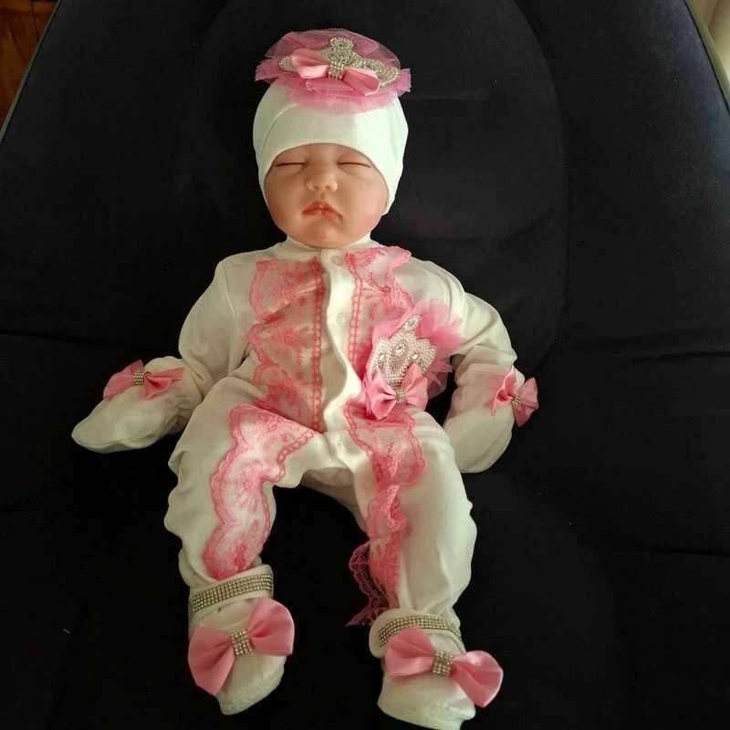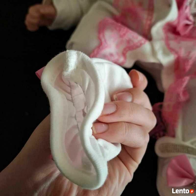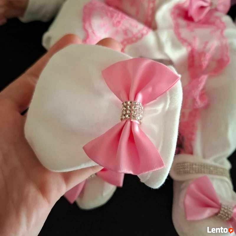 Nowy zestaw niemowlęcy dla dziewczynki w rozmiarze 56–62 cm (1–3 miesiące), bez metki. W skład kompletu wchodzą: pajacyk, rękawiczki, czapeczka i buciki.Kolor pudrowego różu, materiał 100% bawełna — miękki i oddychający. Zestaw wygodny, stylowy i starannie wykonany. Idealny jako wyprawka, prezent dla maluszka lub strój do sesji zdjęciowej.