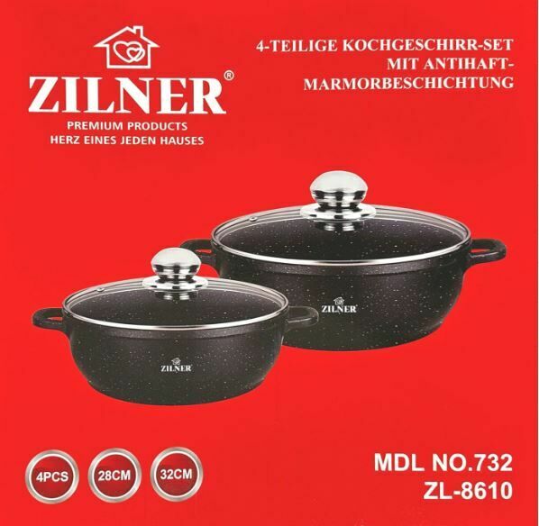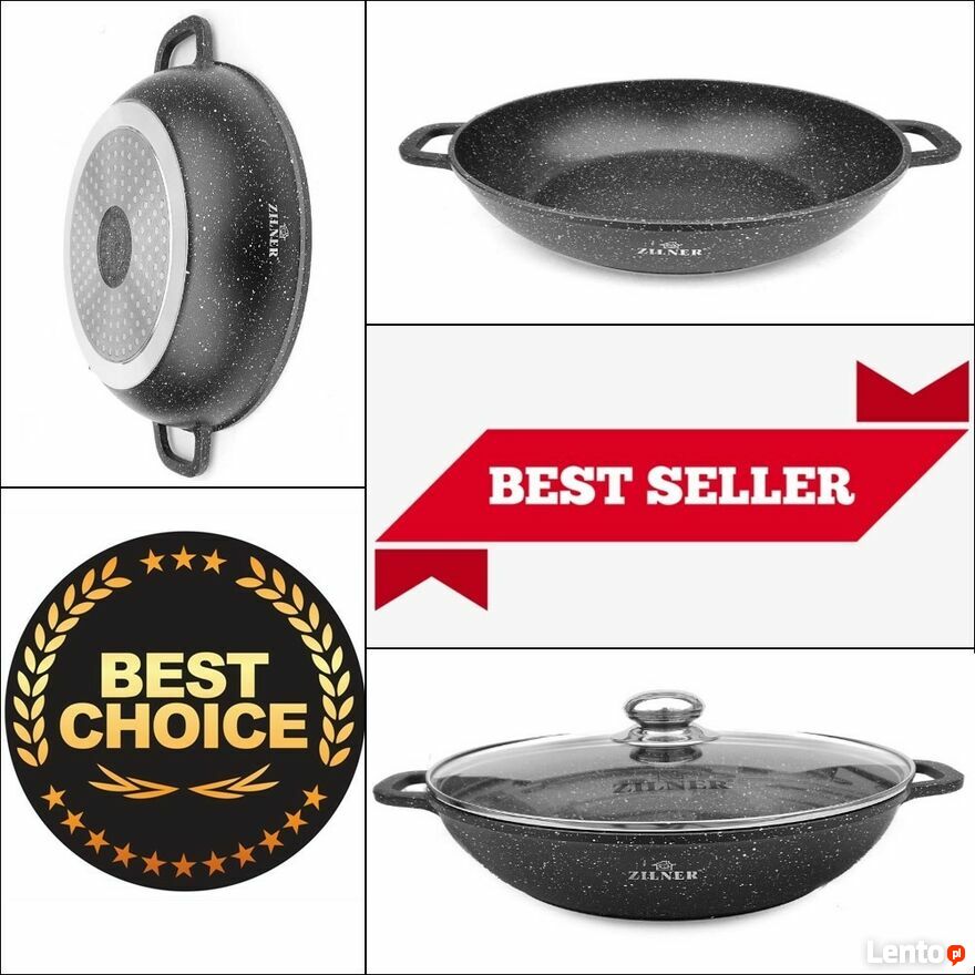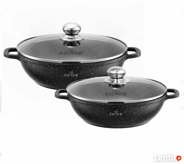 W ofercie zestaw 2 garnków/woków z powłoką marmurową 28/32cm ZILNER ZL-8610 4 ELE.Zestaw wysokiej jakości niskich garnków 3.3L/28cm oraz 5.5L/32 cm.