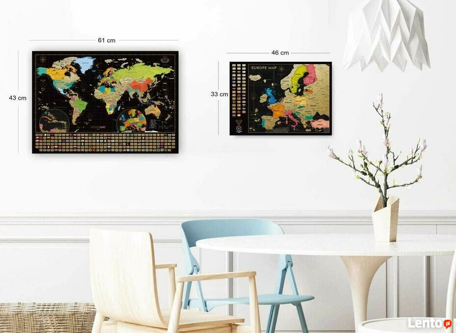 Nasz pakiet zawiera dwie mapy – 1 mapę globusa + 1 mapę Europy – oraz drapak i zabawne naklejki, aby dostosować je do własnych wyjątkowych doświadczeń podróży. Nasze mapy są produkowane w Polsce i są produkowane z materiałów najwyższej jakości, dzięki czemu można łatwo zarysować konkretne miejsca. Specjalnie wykonane z unikalnej powłoki, można upewnić się, że żadne części nie zostaną porysowane w opakowaniu lub podczas transportu. Nareszcie możesz zaplanować swoje wymarzone wakacje dzięki temu pięknemu wystrojowi mapy!