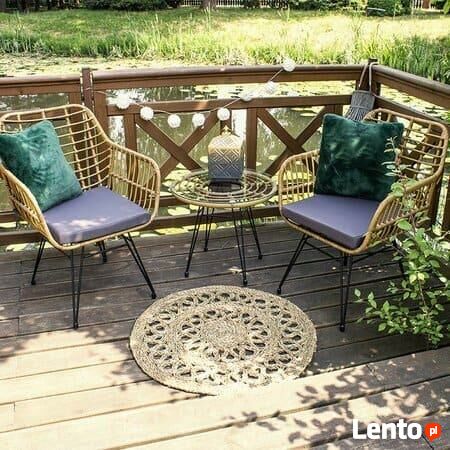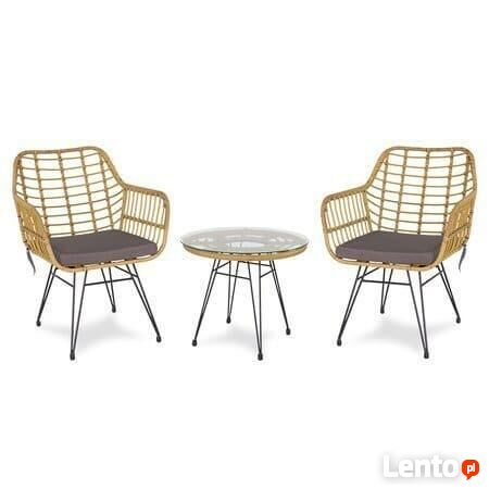 Piękny trzyczęściowy zestaw składający się z dwóch krzeseł z szarą poduszką oraz małego stolika z blatem ze szkła hartowanego.Stworzy przytulne miejsce na balkonie lub tarasie chociaż jego ponadczasowy design będzie pasować również w salonie czy jadalni.