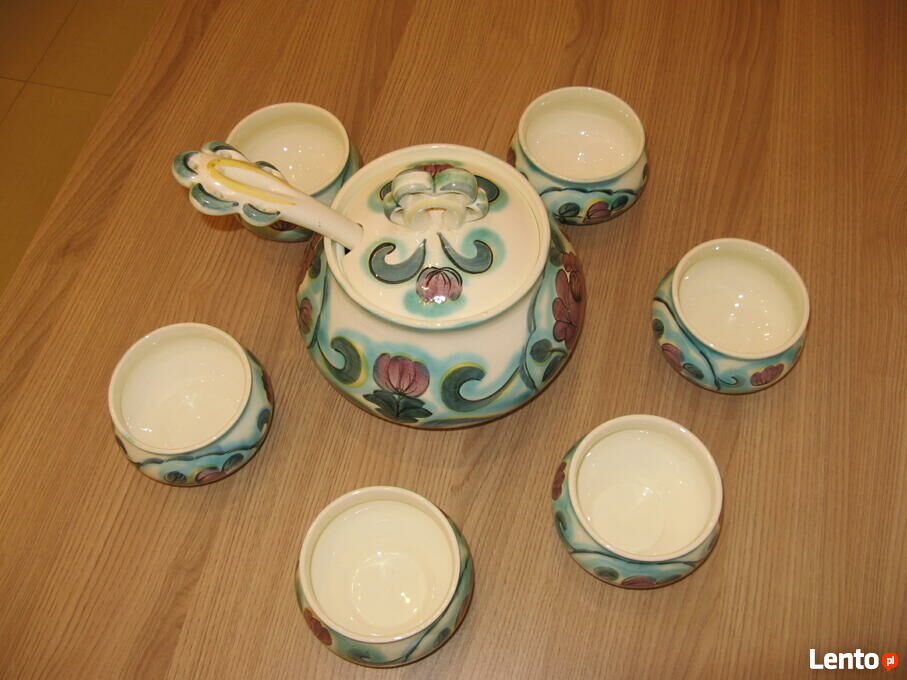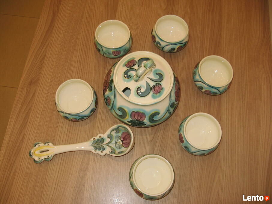 Sprzedam zestaw sześciu miseczek-talerzy plus waza z wieczkiem oraz nabierka.Ozdobny, ręcznie malowany fajans.