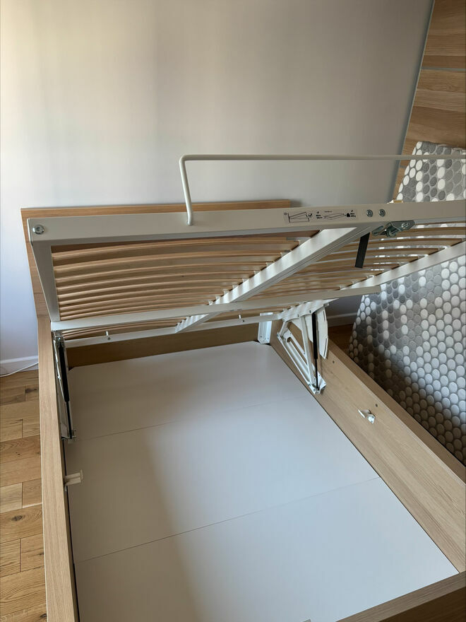 - Stelaż podnoszony (Gazowy): bardzo solidny, metalowa rama. Podnosi się lekko dzięki siłownikom, odsłaniając ogromną przestrzeń do przechowywania pod całą powierzchnią łóżka (idealne na pościele czy walizki).