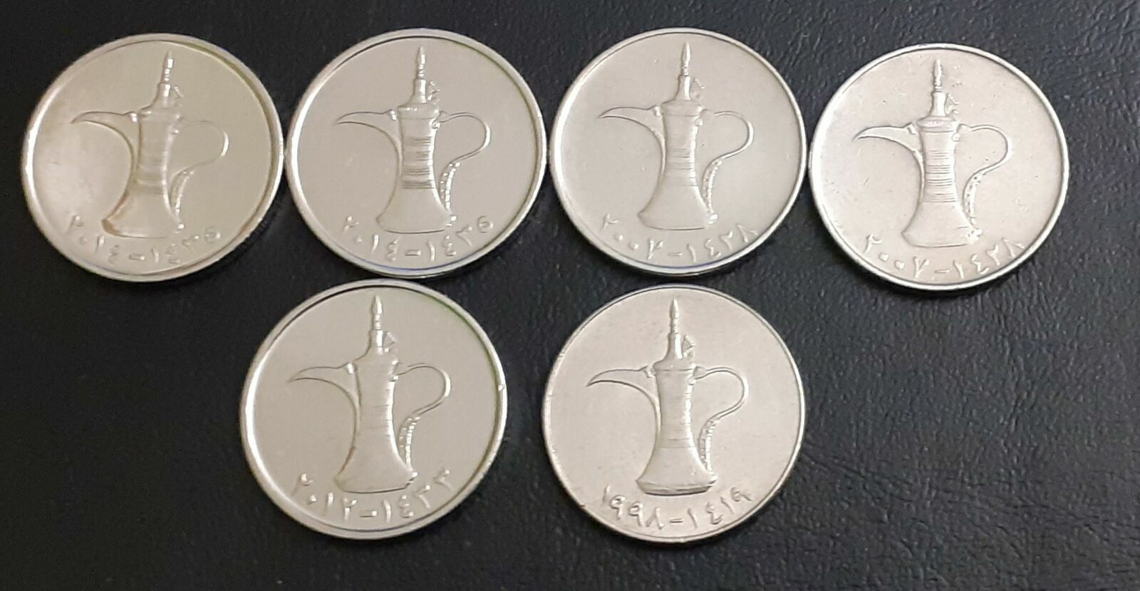 Zestaw sześciu monet 1 dirham Zjednoczonych Emiratów Arabskich.Monety z obiegu, w dobrym stanie.
