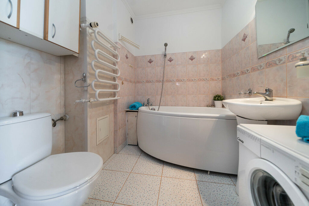 umywalka, toaleta i pralka. W salonie balkon francuski. Okna