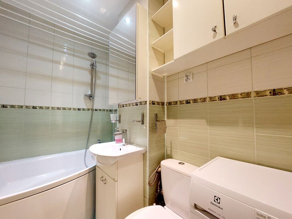 W wyposażeniu wanna, pralka oraz funkcjonalne szafki.
