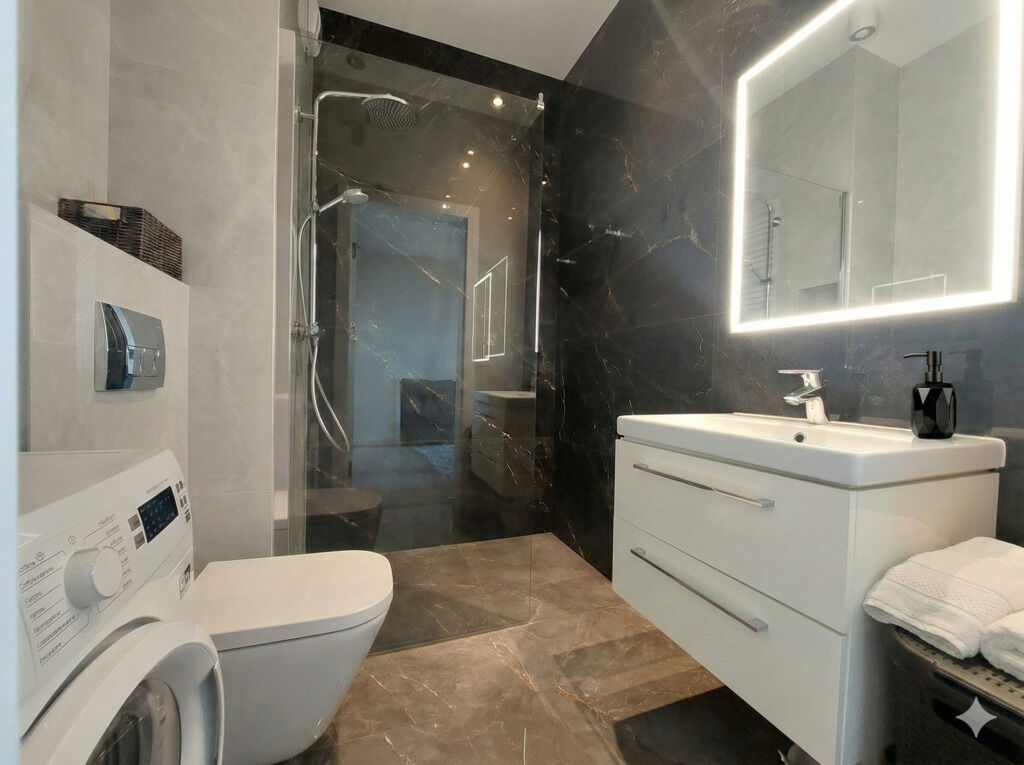 walk-in, umywalką, toaletą i pralką. Na uwagę zasługują