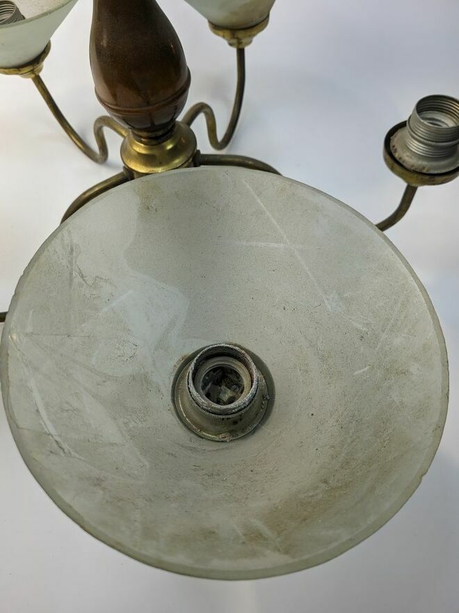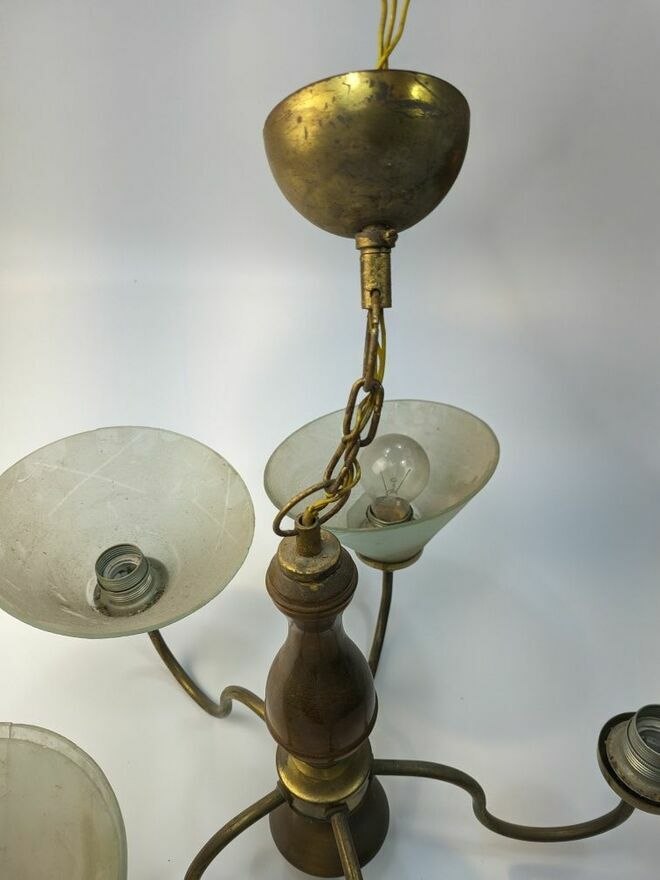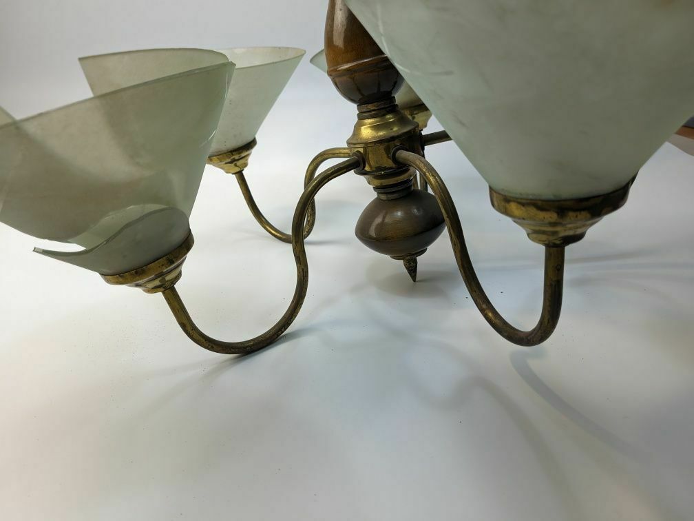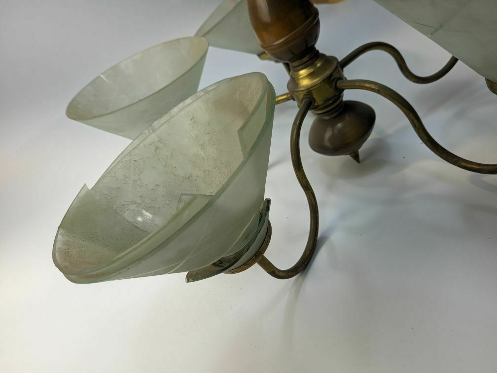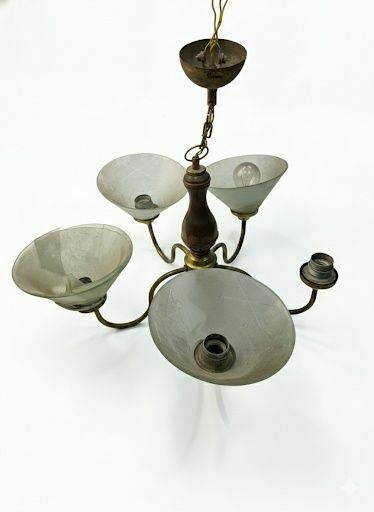 Żyrandol prawdopodobnie z okolicy 1950r, wtedy to mieszkanie było meblowane. 2 klosze są potłuczone, ale raczej kompletne. Instalacja i oprawki oryginalne. Brak nazwy wytwórcy w widocznym miejscu.Leżało z 20 lat w piwnicy. Odbiór raczej osobisty.